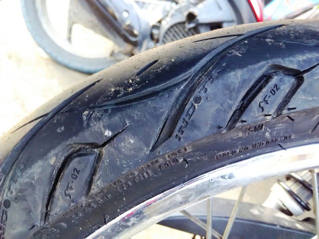 Eksekusi dilakukan, SF-02 90-80/17 tubeless dicopot dari jabatannya setelah sukses mengantarkan penulis wara – wiri keliling belantara Jabodetabek sekitarnya.. PP Jakarta – Banjarsari beberapa kali, main ke lembang, Ciwidey, main ke pasir pantai pangandaran, dan tugas terakhirnya adalah mengantarkan penulis dan adik ke kota sejuta kenangan.. Yogyakarta. Ban ini masih terlihat mulus jika diamati dari jauh.. walau tidak memiliki pattern tengah, SF-02 ini benar – benar ngga licin, namun kondisi retaknya mengkhawatirkan. Oya harga Rp.100.000; itu pas ditebus entah faktor lucky atau ngga.. sellernya waktu itu bilang salah beli ban.. wkwkwkwk.